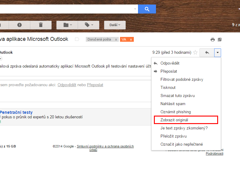 Pokud používáte Gmail.com, tak stačí otevřít požadovanou zprávu, kliknout na ikonku šipky směřem dolů a na tlačítko „Zobrazit originál“.