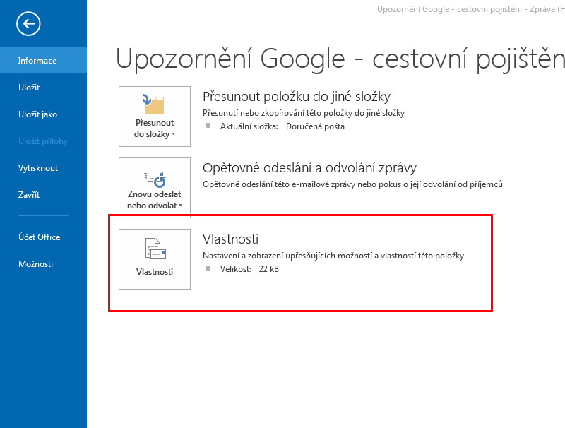 V klientovi MS Outlook 2013 nejdříve vyhledejte zprávu, u které chcete hlavičku zobrazit a tuto zprávu dvojklikem otevřete. Následně kliknete na kartu „Soubor“ a na tlačítko „Vlastnosti“.