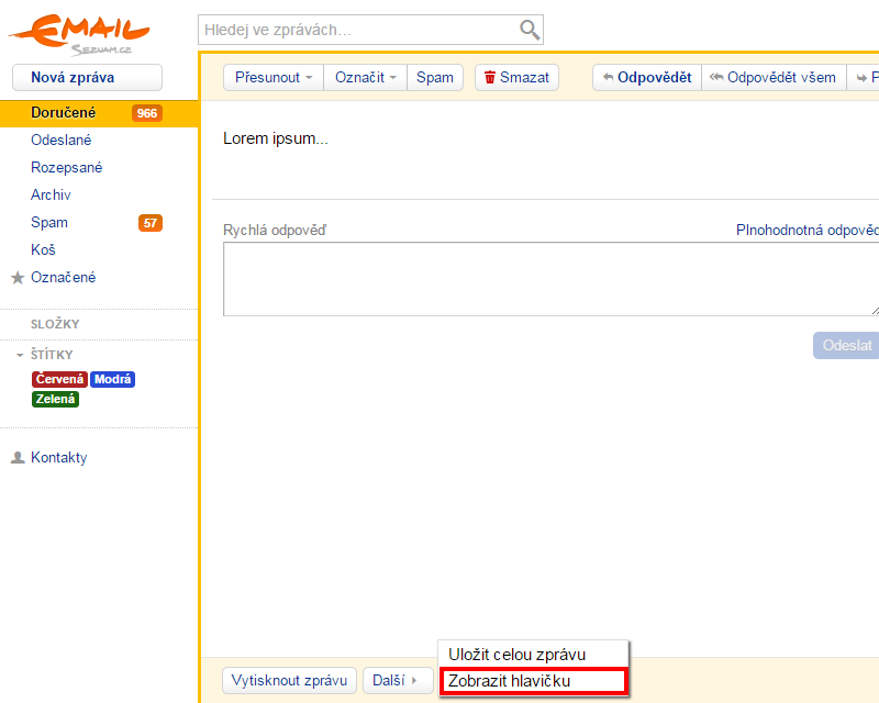 Ve webovém rozhraní schránky na Seznam.cz stačí najít požadovanou zprávu, v dolní části stránky kliknout na „Další“ a následně na „Zobrazit hlavičku“.