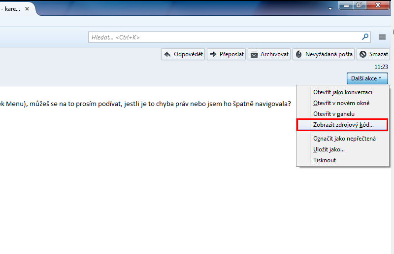 V klientovi Mozilla Thuderbird stačí najít požadovanou zprávu a kliknout na tlačítko „Další akce“ a následně na „Zobrazit zdrojový kód“.